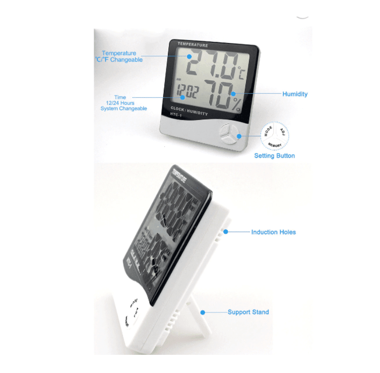 Ceas cu termometru si aparat de masura a umiditatii digital, cu ecran LCD mare, un design simplu si elegant. Aparat profesional care, pe langa functia de ceas digital si alarma are si 2 senzori, unul de temperatura si unul de umiditate care indica in fiecare moment temperatura si umiditatea din camera dumneavoastra.
